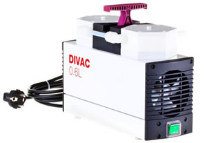 The dry compressing DIVAC diaphragm pumps were developed for laboratory operations It satisfies the highest expectations in terms of precision, reliability and ease of use. Beside one-stage DIVAC pumps there also are two-stage versions DIVAC L and modular pump systems DIVAC SR, SH and SC available. The DIVAC T-version especially was designed for use as backing pump for (wide range) turbomolecular pumps. The DIVAC family of diaphragm vacuum pumps are the smallest dry pumps available in our portfolio. Their maximum pumping speed ranges from 0.6 m³/h to 4.8 m³/h.